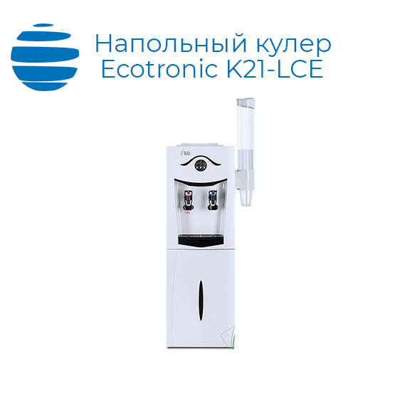 Напольный кулер со шкафчиком. Электронное охлаждение. Корпус белого цвета с черной глянцевой вставкой лицевой панели. Шкафчик для хранения. Краны с нажимом «кружкой». Лицевая панель-индикатор. Отдельные выключатели на нагрев и охлаждение на задней стенке, вместительные баки горячей и холодной воды. Возможность размещения подстаканника.
